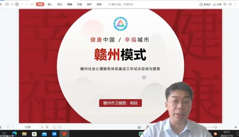 接着是赣州市卫健委四级主管杨硕进行《赣州社会心理服务体系建设三年试点工作总结汇报》。杨主管从赣州三年试点工作总结、赣州模式以及下一步工作规划三个方面分享了赣州社会心理服务体系建设的实践经验与思考。