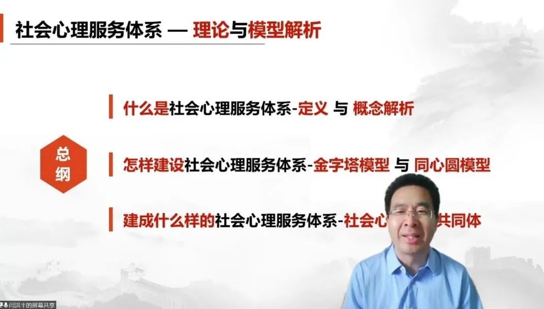 首先是国家社会心理服务体系建设试点地区专家、《社会心理服务体系解析》主编闫洪丰老师进行主题为“社会心理服务体系建设解析与实践”的精彩分享。闫老师结合实际案例系统阐释了社会心理服务体建设的内涵、方法和目标,特别强调体系建设要以解决问题为导向,整合和运用多学科理论方法,积极探索适合中国国情、地方特色和融贯中华优秀传统文化的社会心理服务体系建设路径。