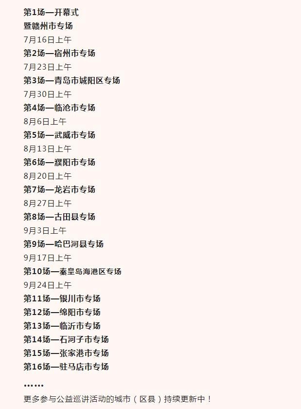 公益巡讲活动由中国社会工作联合会青少年与学校社会工作委员会、中国人口文化促进会社会心理服务工作委员会、中国心理学会心理危机干预工作委员会共同指导,赣州市、宿州市、青岛市城阳区、临沧市、武威市、濮阳市、龙岩市、古田县、哈巴河县、秦皇岛市海港区、银川市、绵阳市、临沂市、石河子市、张家港市、驻马店市以及其他参与公益巡讲活动的地区联合主办,江西省社会心理服务体系建设研究中心以及各主办地区的有关学会、协会等协办,梧桐村心理、心世界(北京)教育科技有限公司等社会心理服务机构支持。
